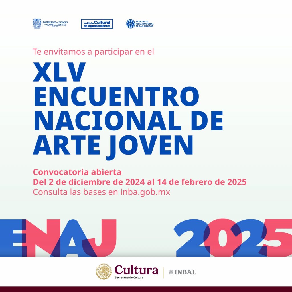 La Secretaría de Cultura del Gobierno de México, el Instituto Nacional de Bellas Artes y Literatura (Inbal), a través de la Coordinación Nacional de Artes Visuales (CNAV), el Gobierno del Estado de Aguascalientes, el Instituto Cultural de Aguascalientes (ICA) y el Patronato de la Feria Nacional de San Marcos, anuncian la apertura de la convocatoria para el XLV Encuentro Nacional de Arte Joven 2025.